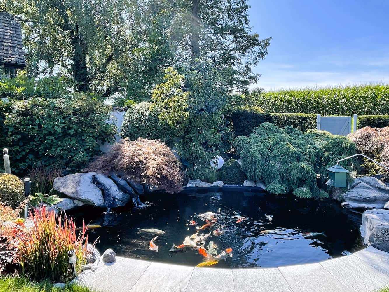 Während Wasser in anderen Formen des Japangartens, wie etwa dem Zengarten, nur metaphorisch verwendet wird, ist es im Teichgarten ein realer und zentraler Bestandteil. Legen wir einen solchen Garten für unsere Kunden an, ist die Wasserfläche in der Regel das erste Gestaltungselement bei der Planung. Um den Teich herum wird dann der Rest der Aussenanlage entworfen.